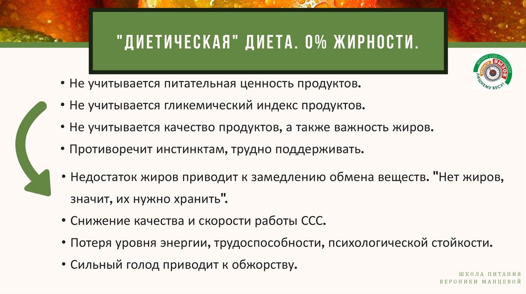 "ДИЕТИЧЕСКАЯ" ДИЕТА. 0% ЖИРНОСТИ.• Не учитывается питательная ценность продуктов.