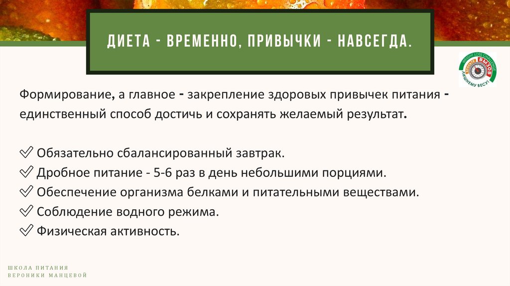 Д И Е Т А - ВРЕ МЕН Н О, П РИ ВЫ Ч КИ - Н АВСЕГДА.Формирование, а главное - закрепление здоровых привычек питания единственный способ достичь и сохранять желаемый результат.