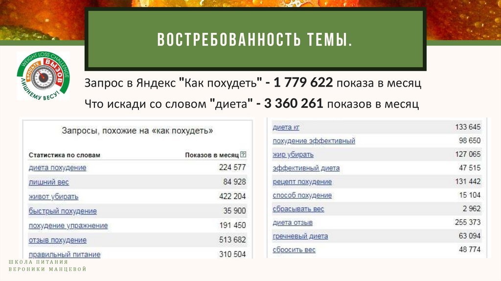 ВОСТРЕБОВАННОСТЬ ТЕМЫ.Запрос в Яндекс "Как похудеть" - 1 779 622 показа в месяц