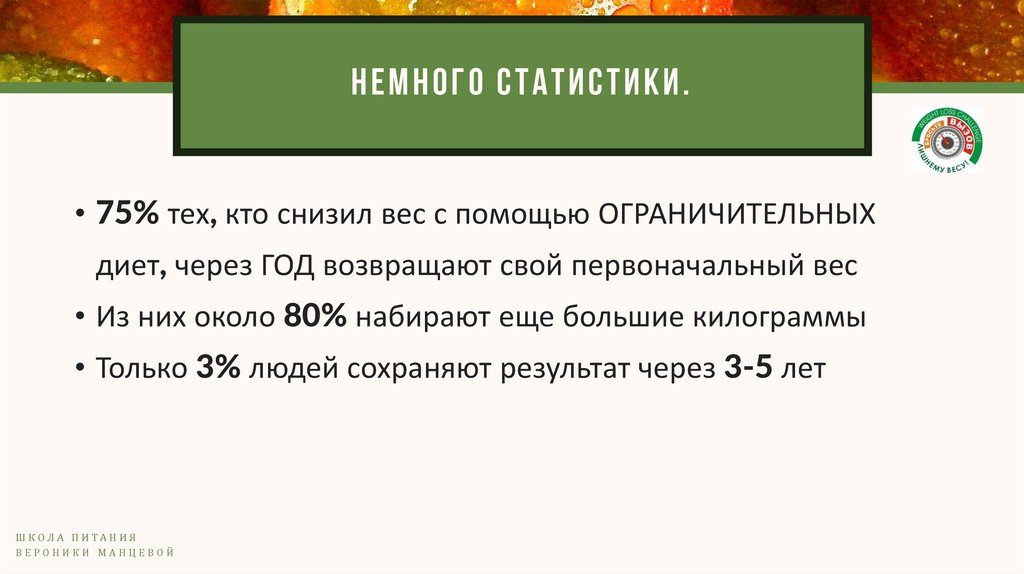 НЕМНОГО СТАТИСТИКИ.• 75% тех, кто снизил вес с помощью ОГРАНИЧИТЕЛЬНЫХ