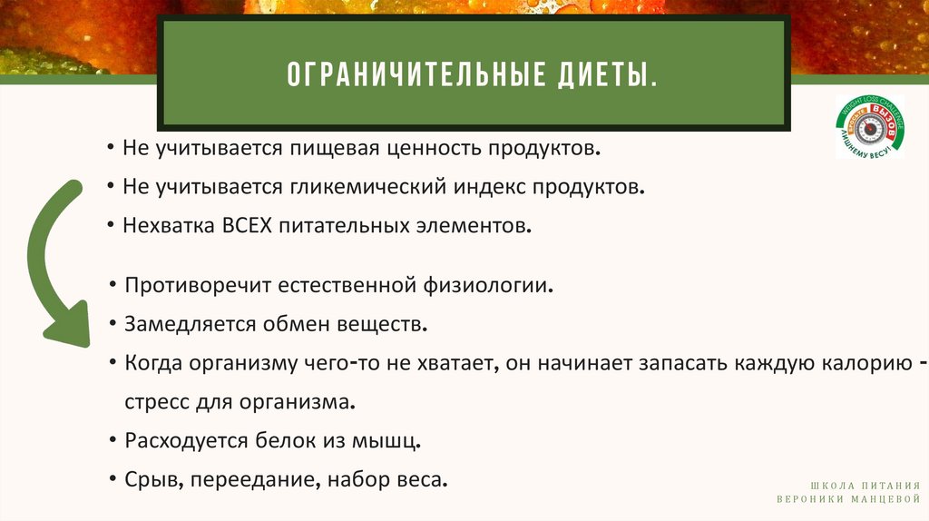 ОГРАНИЧИТЕЛЬНЫЕ ДИЕТЫ.• Не учитывается пищевая ценность продуктов.