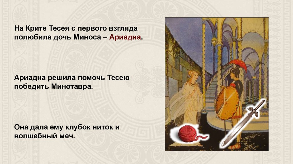 На Крите Тесея с первого взглядаполюбила дочь Миноса – Ариадна.