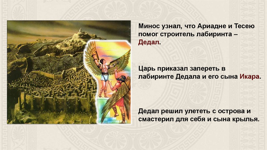 Минос узнал, что Ариадне и Тесеюпомог строитель лабиринта –