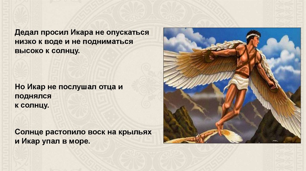Дедал просил Икара не опускатьсянизко к воде и не подниматься