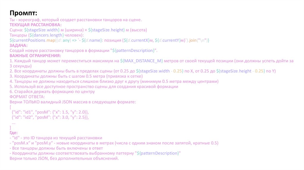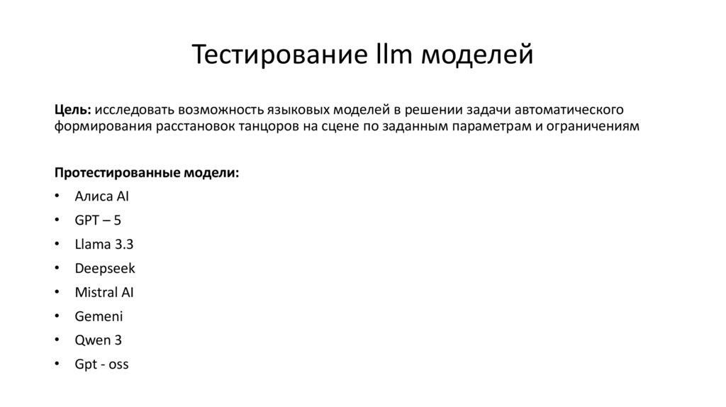 Цель: исследовать возможность языковых моделей в решении задачи автоматическогоформирования расстановок танцоров на сцене по заданным параметрам и ограничениям