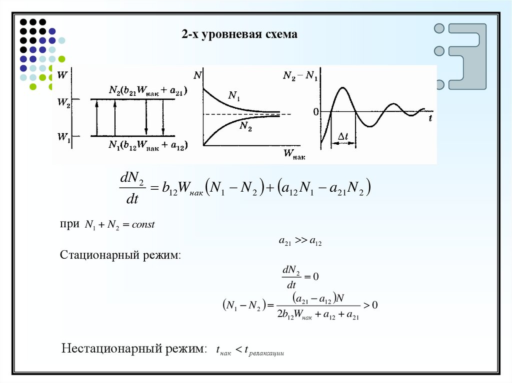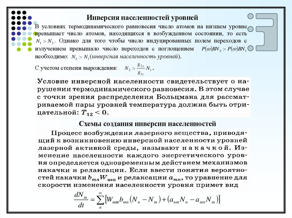 Инверсия населенностей уровнейВ условиях термодинамического равновесия число атомов на низшем уровне