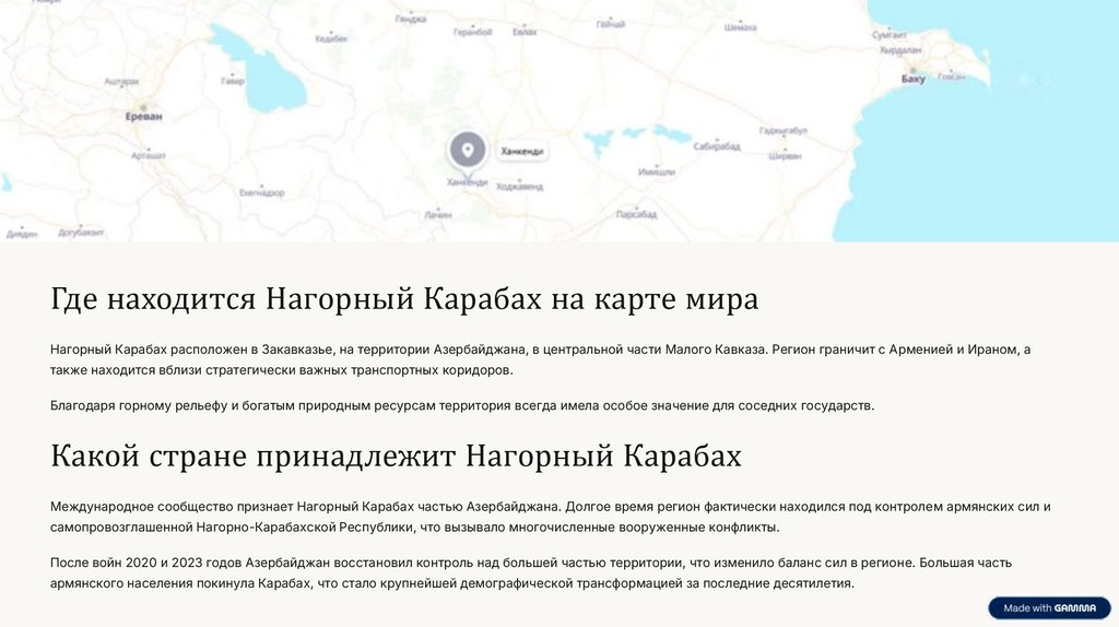 Где находится Нагорный Карабах на карте мираНагорный Карабах расположен в Закавказье, на территории Азербайджана, в центральной части Малого Кавказа. Регион граничит с Арменией и Ираном, а
