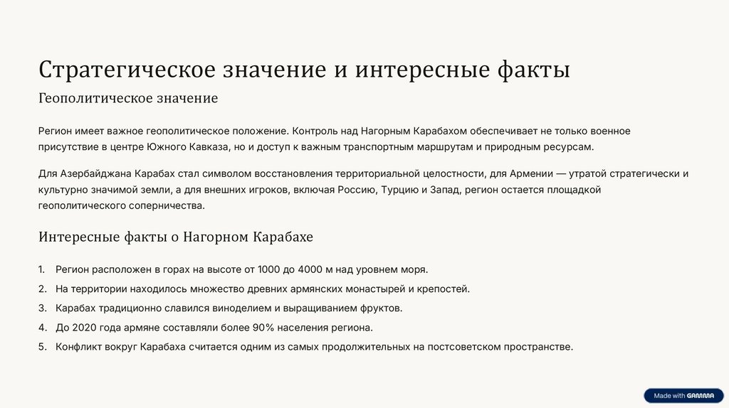 Регион имеет важное геополитическое положение. Контроль над Нагорным Карабахом обеспечивает не только военное