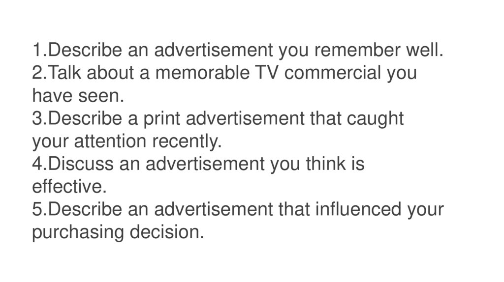 1.Describe an advertisement you remember well.2.Talk about a memorable TV commercial you