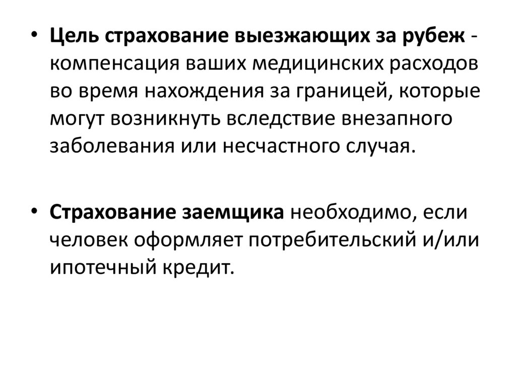 • Цель страхование выезжающих за рубеж компенсация ваших медицинских расходовво время нахождения за границей, которые