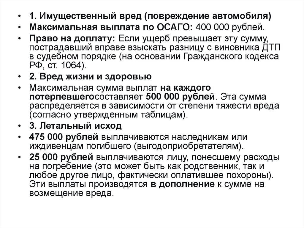 • 1. Имущественный вред (повреждение автомобиля)• Максимальная выплата по ОСАГО: 400 000 рублей.