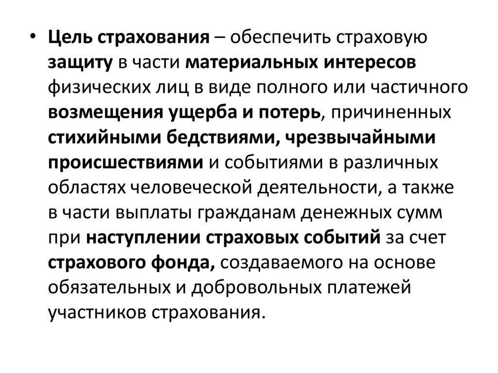 • Цель страхования – обеспечить страховуюзащиту в части материальных интересов