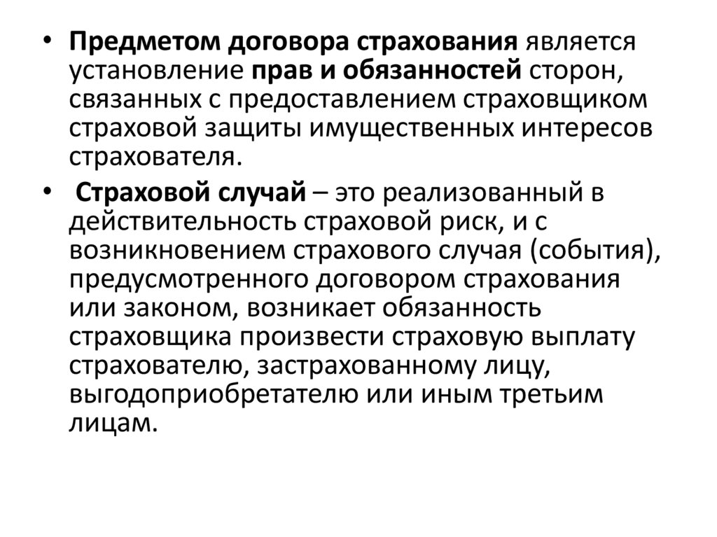 • Предметом договора страхования являетсяустановление прав и обязанностей сторон,