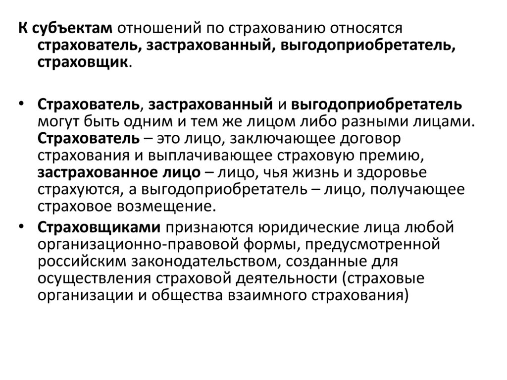 К субъектам отношений по страхованию относятсястрахователь, застрахованный, выгодоприобретатель,