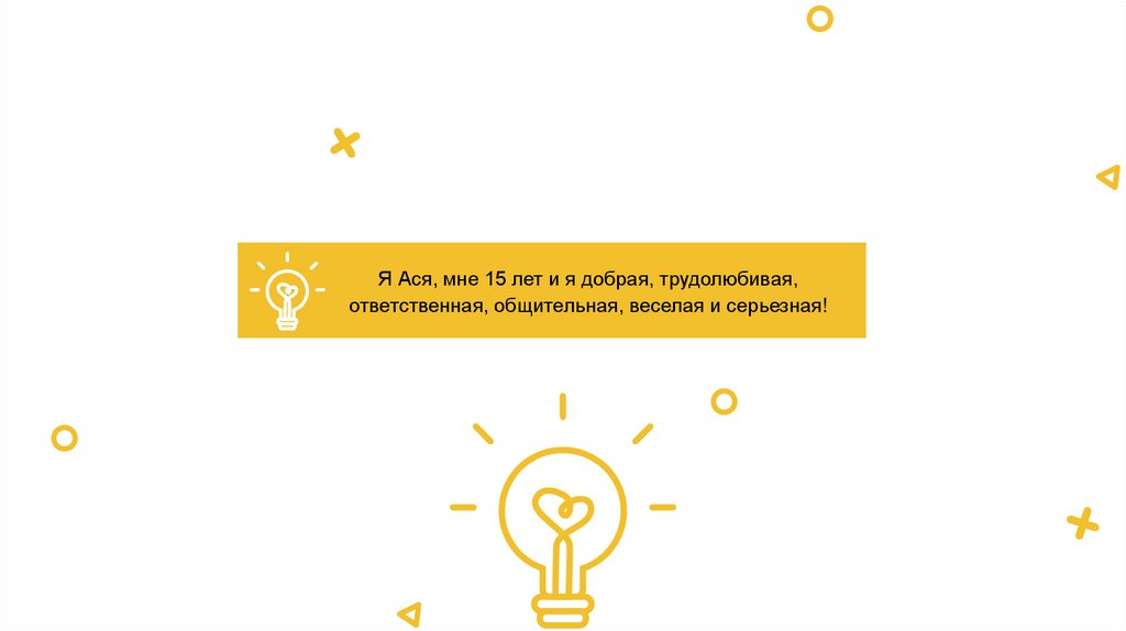 Я Ася, мне 15 лет и я добрая, трудолюбивая,ответственная, общительная, веселая и серьезная!
