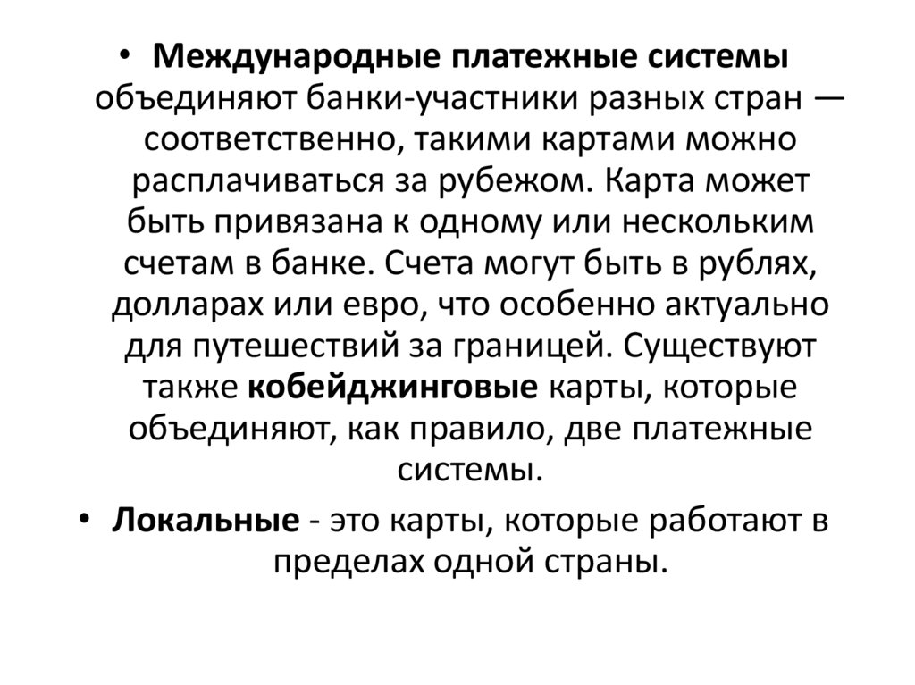 • Международные платежные системыобъединяют банки-участники разных стран —