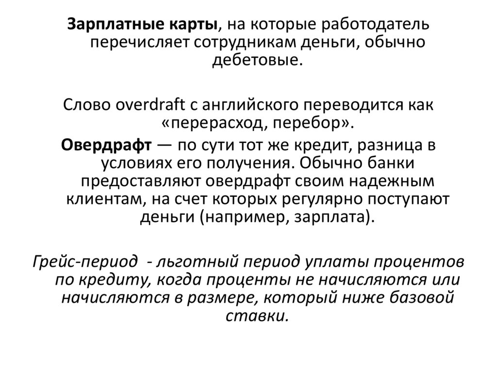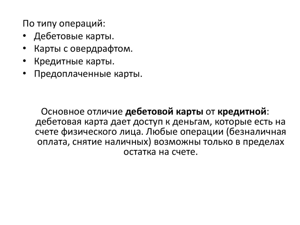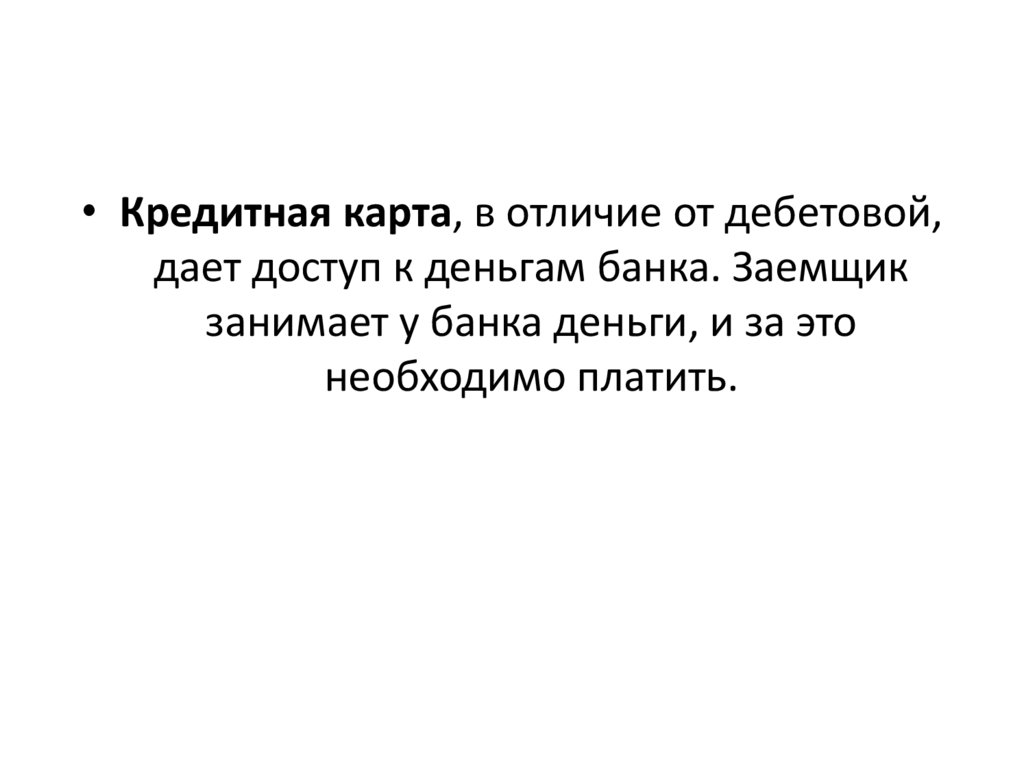 • Кредитная карта, в отличие от дебетовой,дает доступ к деньгам банка. Заемщик