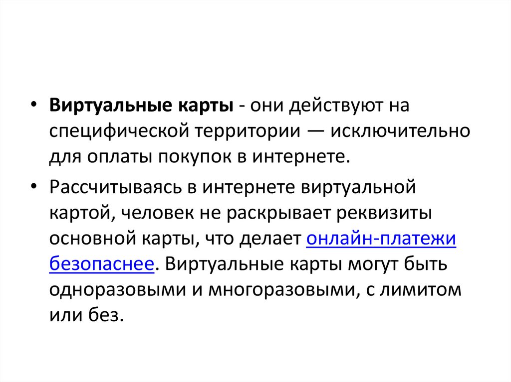 • Виртуальные карты - они действуют наспецифической территории — исключительно