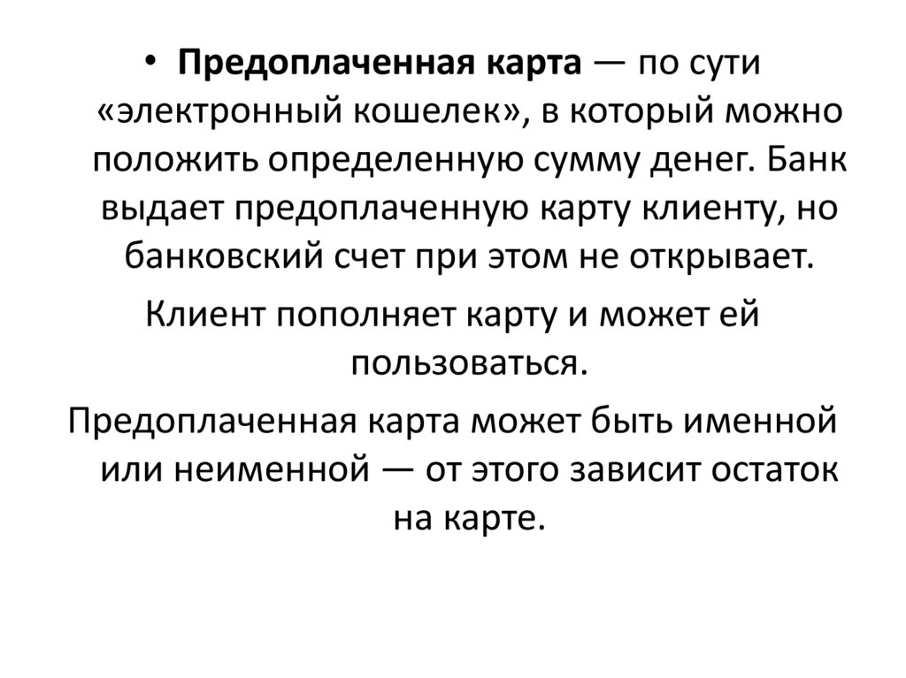 • Предоплаченная карта — по сути«электронный кошелек», в который можно