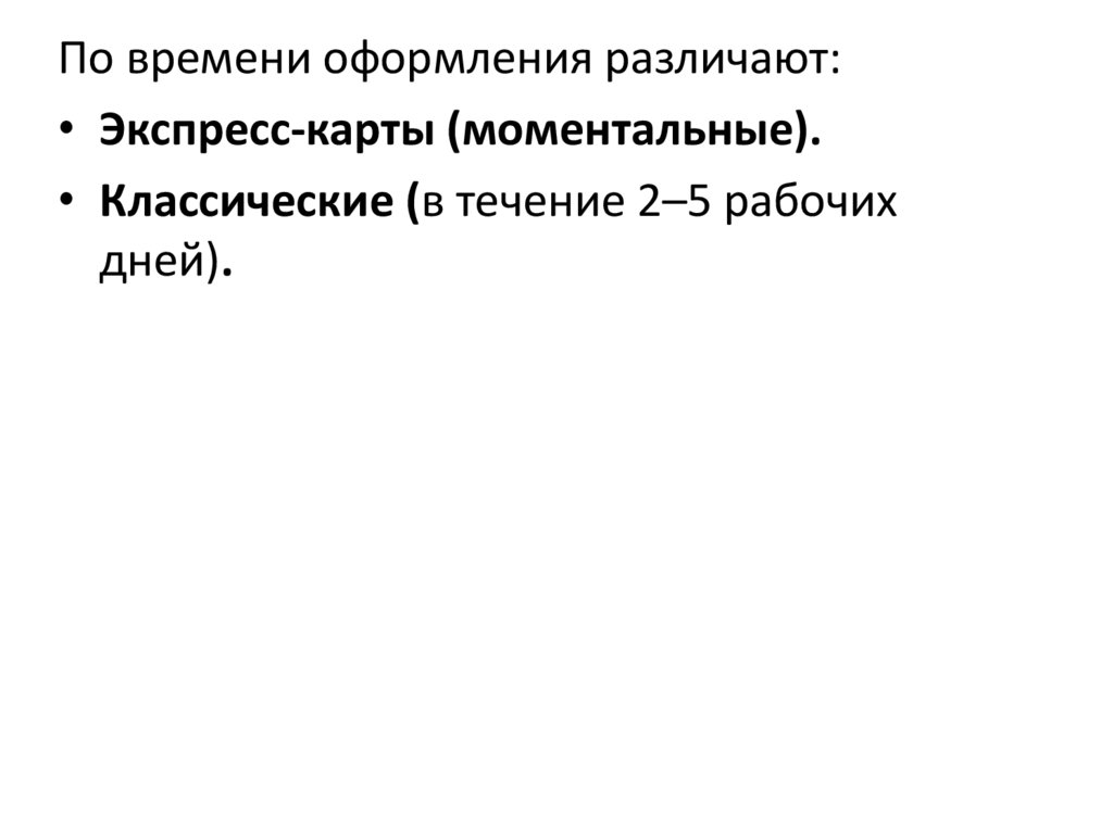По времени оформления различают:• Экспресс-карты (моментальные).