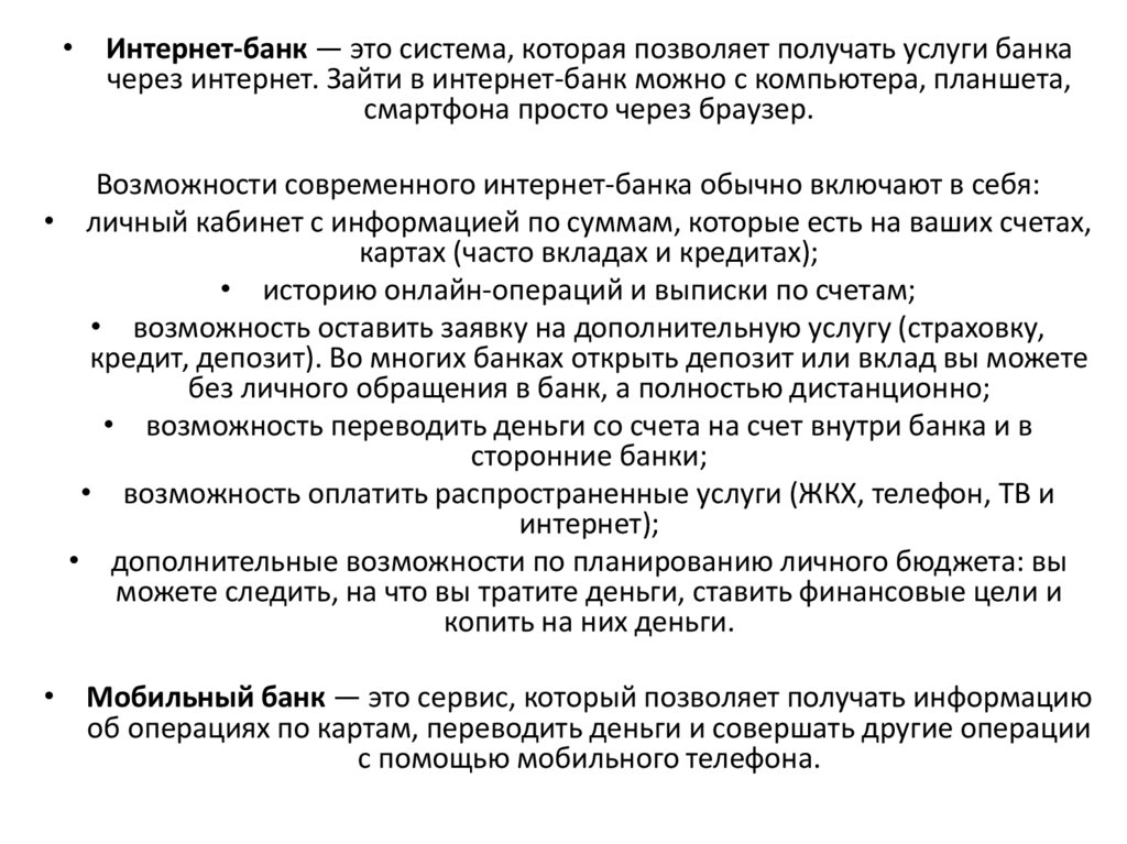 • Интернет-банк — это система, которая позволяет получать услуги банкачерез интернет. Зайти в интернет-банк можно с компьютера, планшета,