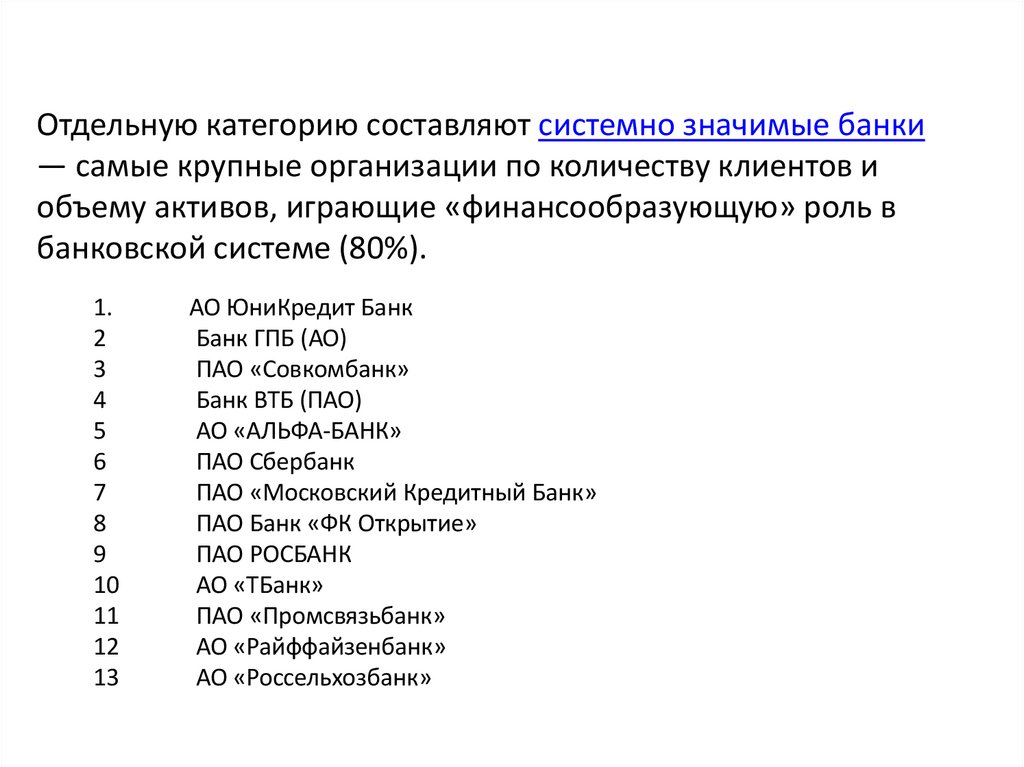 Отдельную категорию составляют системно значимые банки— самые крупные организации по количеству клиентов и