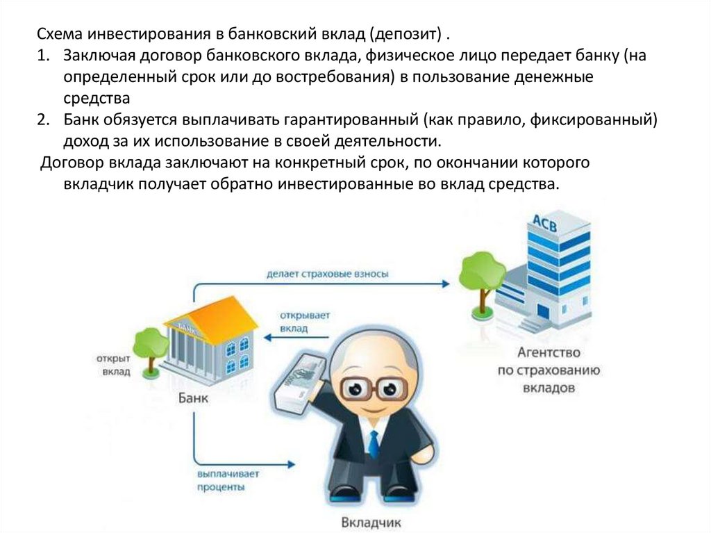 Схема инвестирования в банковский вклад (депозит) .1. Заключая договор банковского вклада, физическое лицо передает банку (на