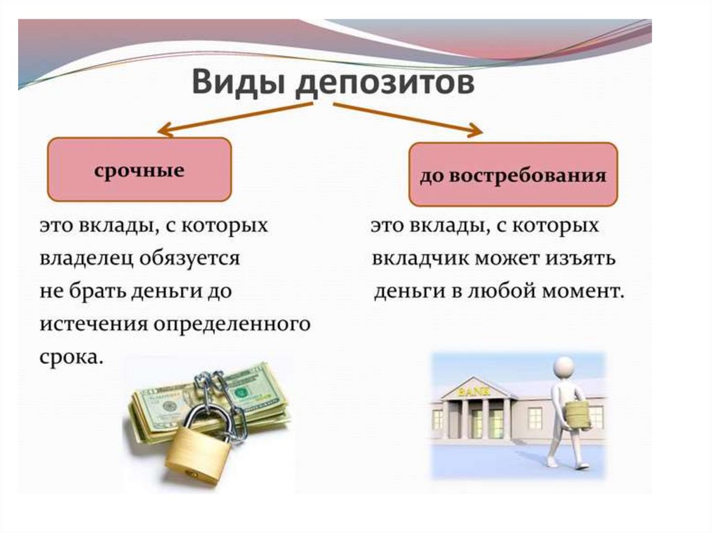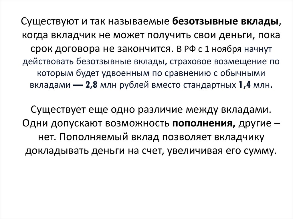 Существуют и так называемые безотзывные вклады,когда вкладчик не может получить свои деньги, пока