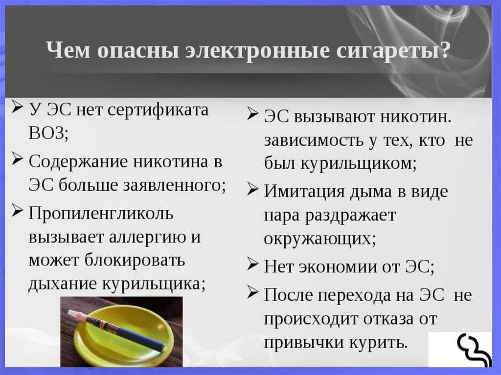 • Курить ЭС в местах, запрещенных для курения, нельзя, т.к.