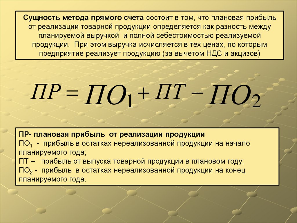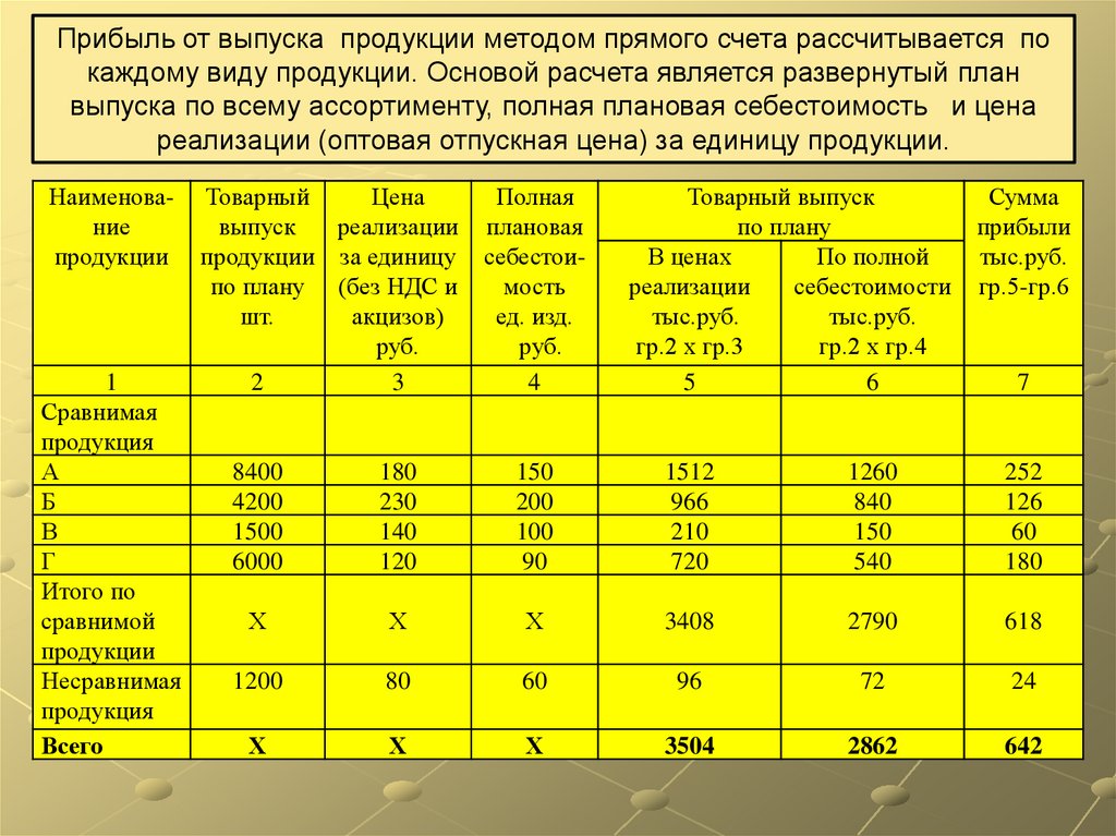 Прибыль от выпуска продукции методом прямого счета рассчитывается покаждому виду продукции. Основой расчета является развернутый план