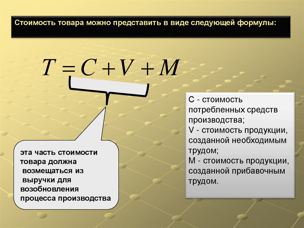 Стоимость товара можно представить в виде следующей формулы:Т С V M
