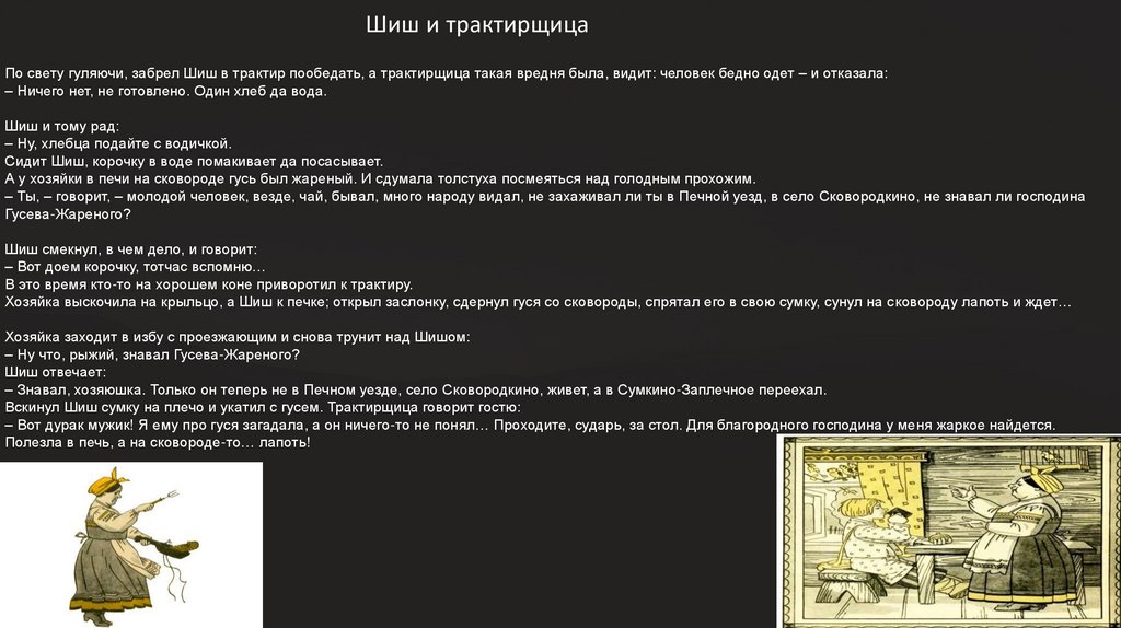 Шиш и трактирщицаПо свету гуляючи, забрел Шиш в трактир пообедать, а трактирщица такая вредня была, видит: человек бедно одет – и отказала: