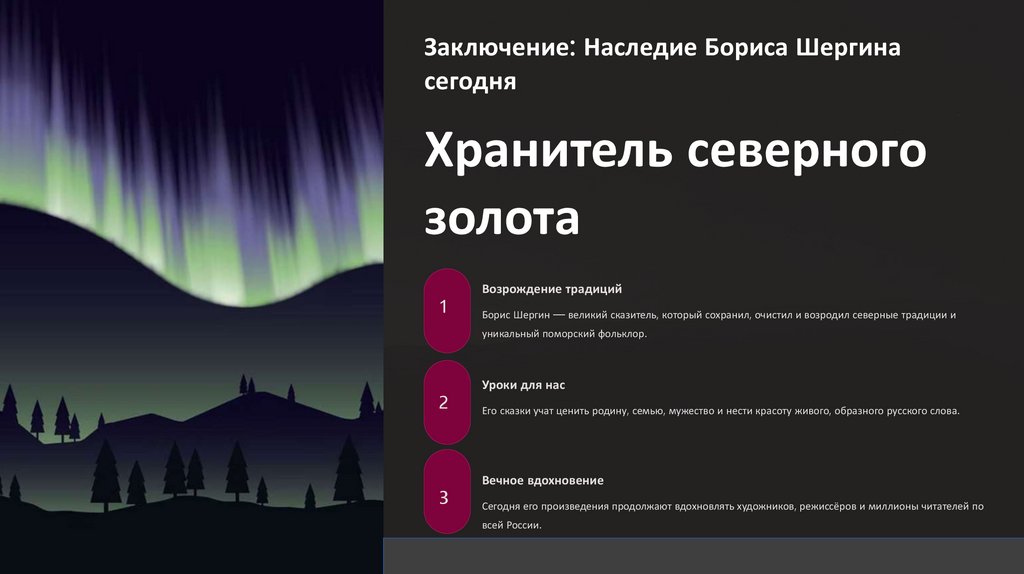 Его сказки учат ценить родину, семью, мужество и нести красоту живого, образного русского слова.