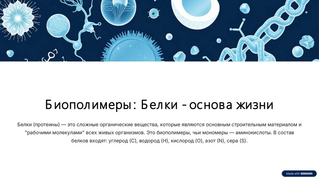 Б иопол имеры : Б ел ки - основа жизниБелки (протеины) — это сложные органические вещества, которые являются основным строительным материалом и