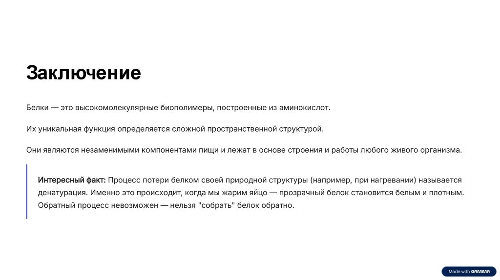 ЗаключениеБелки — это высокомолекулярные биополимеры, построенные из аминокислот.