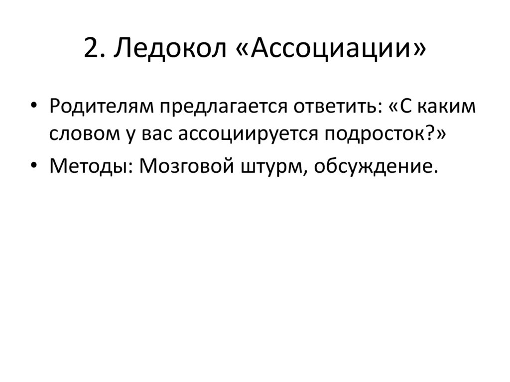 2. Ледокол «Ассоциации»• Родителям предлагается ответить: «С каким