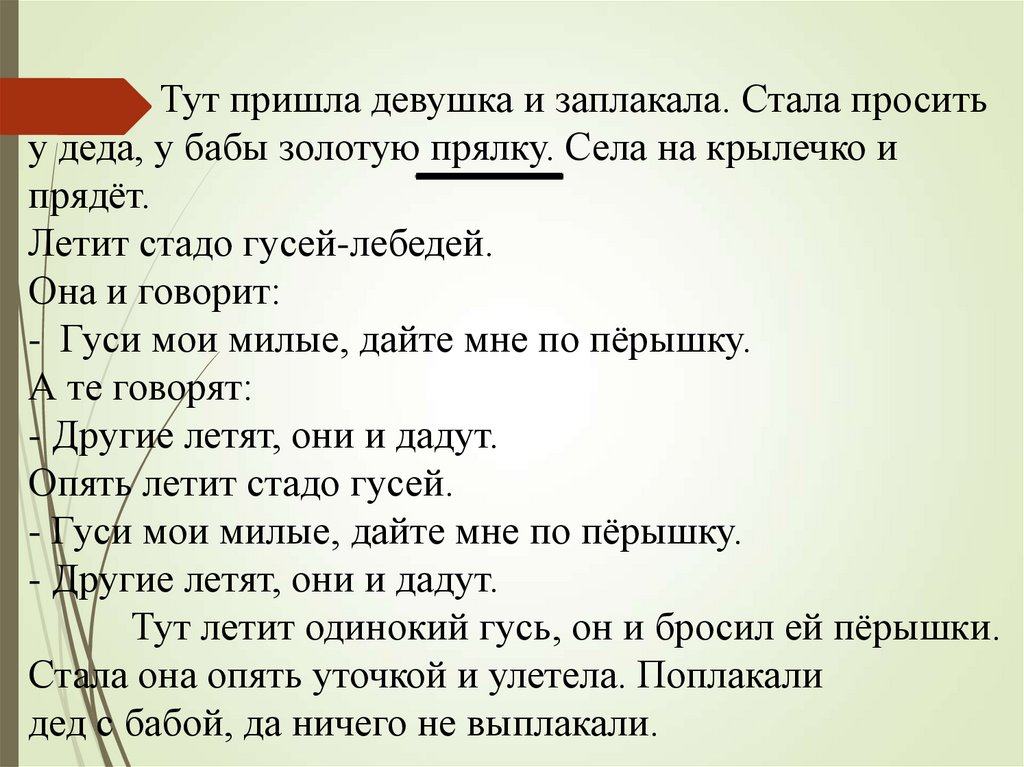 - Гуси мои милые, дайте мне по пёрышку.