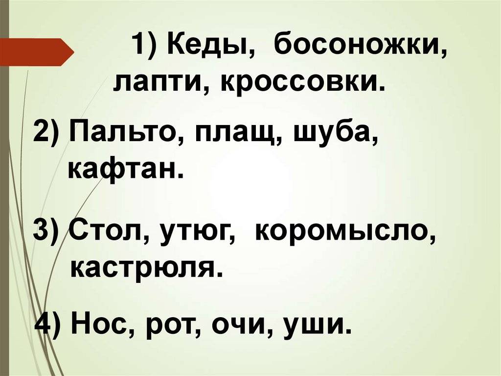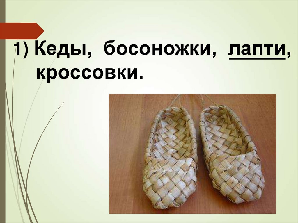 1) Кеды, босоножки,лапти, кроссовки.