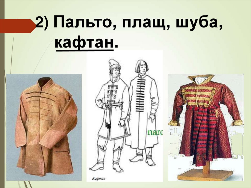 2) Пальто, плащ, шуба,кафтан.