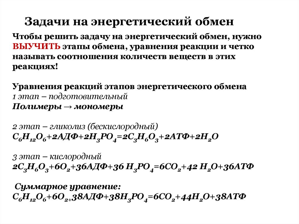 Чтобы решить задачу на энергетический обмен, нужноВЫУЧИТЬ этапы обмена, уравнения реакции и четко