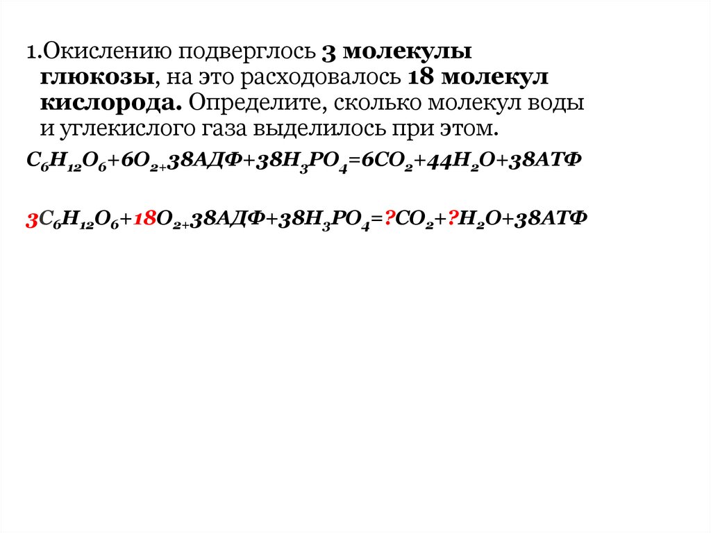 1.Окислению подверглось 3 молекулыглюкозы, на это расходовалось 18 молекул