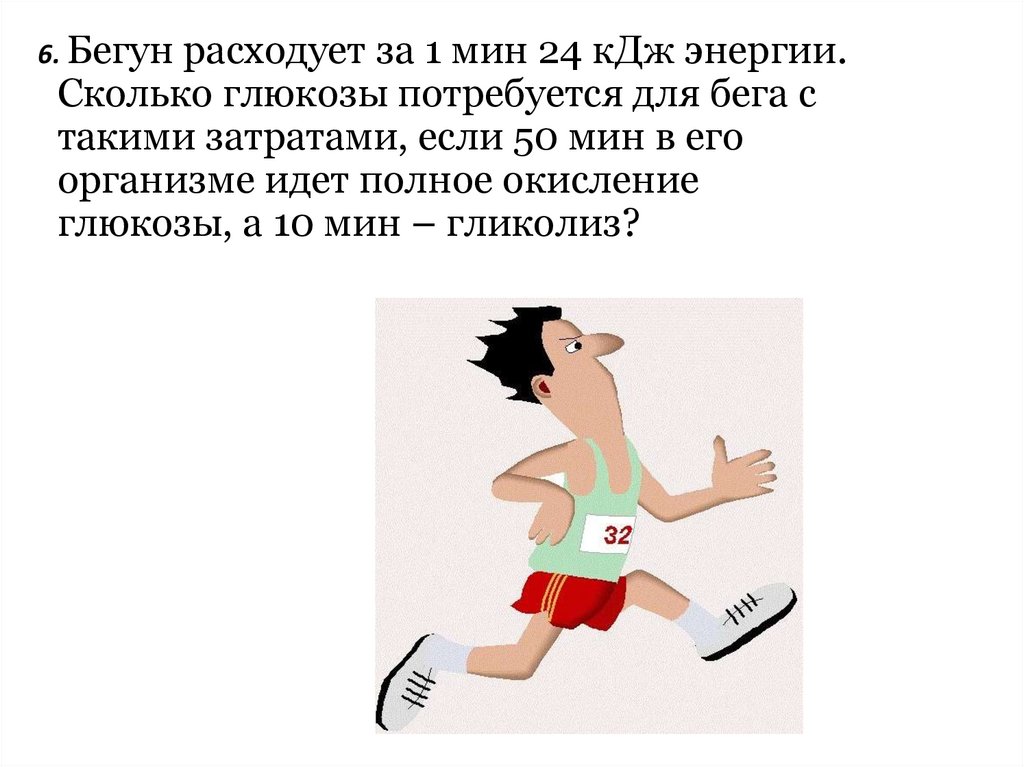 6. Бегун расходует за 1 мин 24 кДж энергии.Сколько глюкозы потребуется для бега с