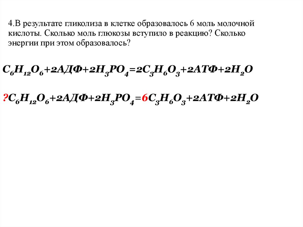 4.В результате гликолиза в клетке образовалось 6 моль молочнойкислоты. Сколько моль глюкозы вступило в реакцию? Сколько