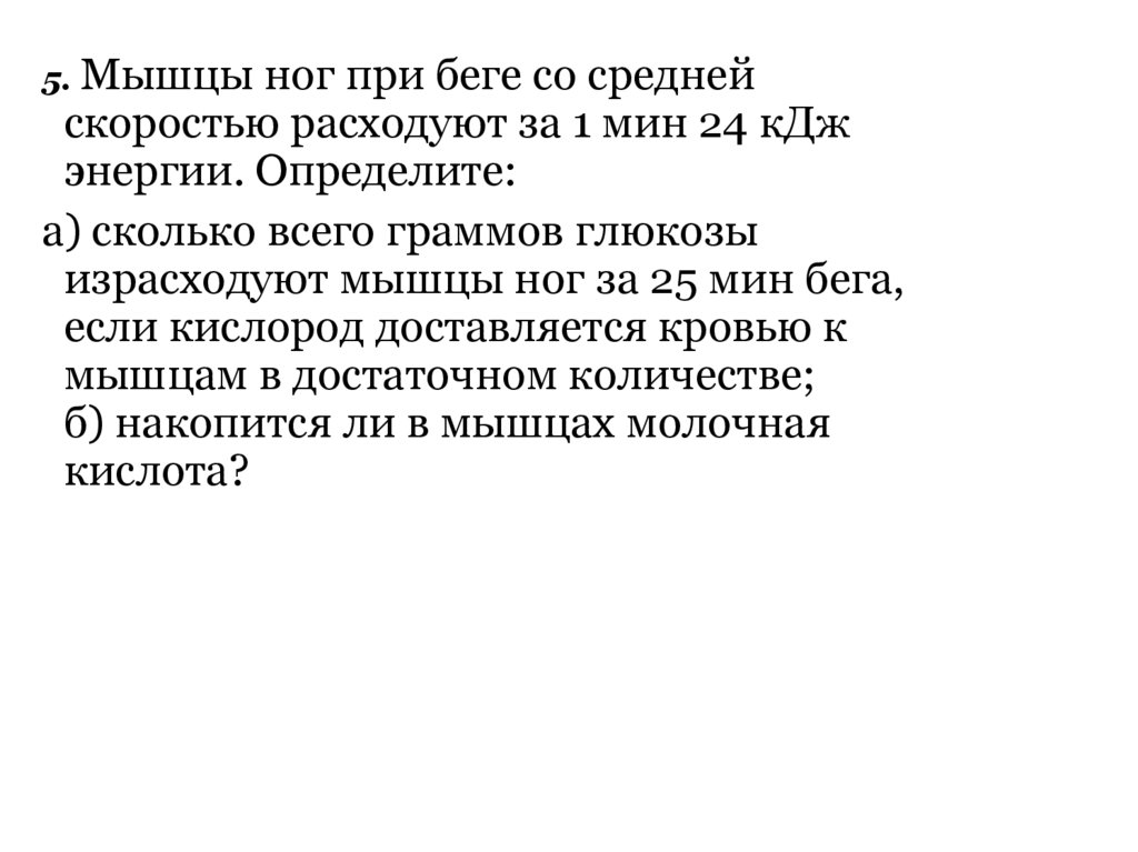 5. Мышцы ног при беге со среднейскоростью расходуют за 1 мин 24 кДж
