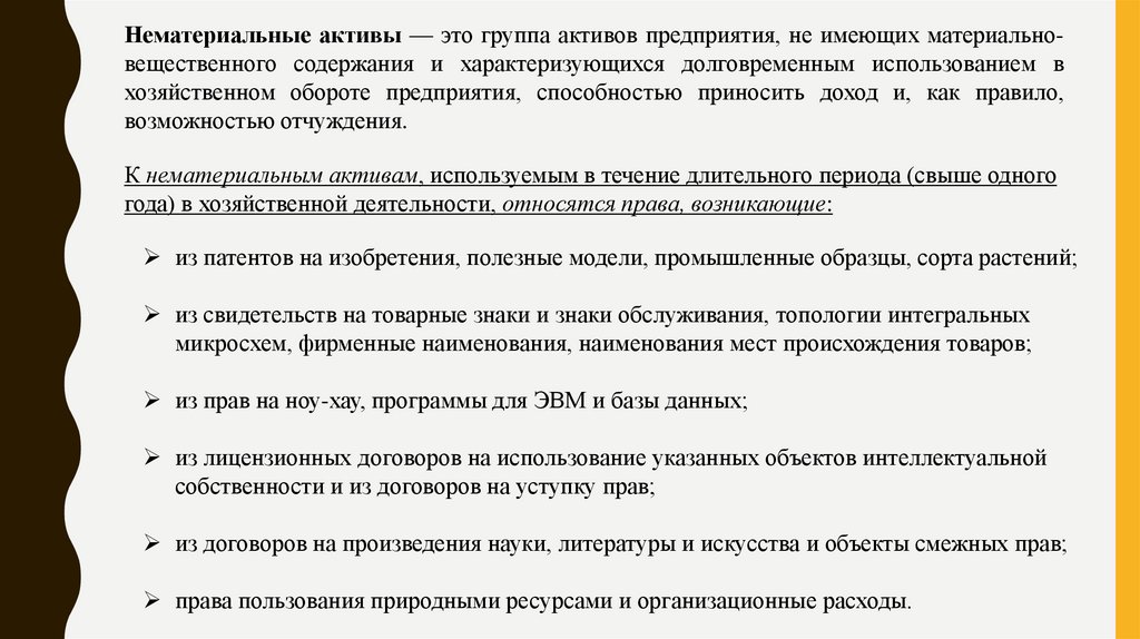 Нематериальные активы — это группа активов предприятия, не имеющих материальновещественного содержания и характеризующихся долговременным использованием вхозяйственном обороте предприятия, способностью приносить доход и, как правило,