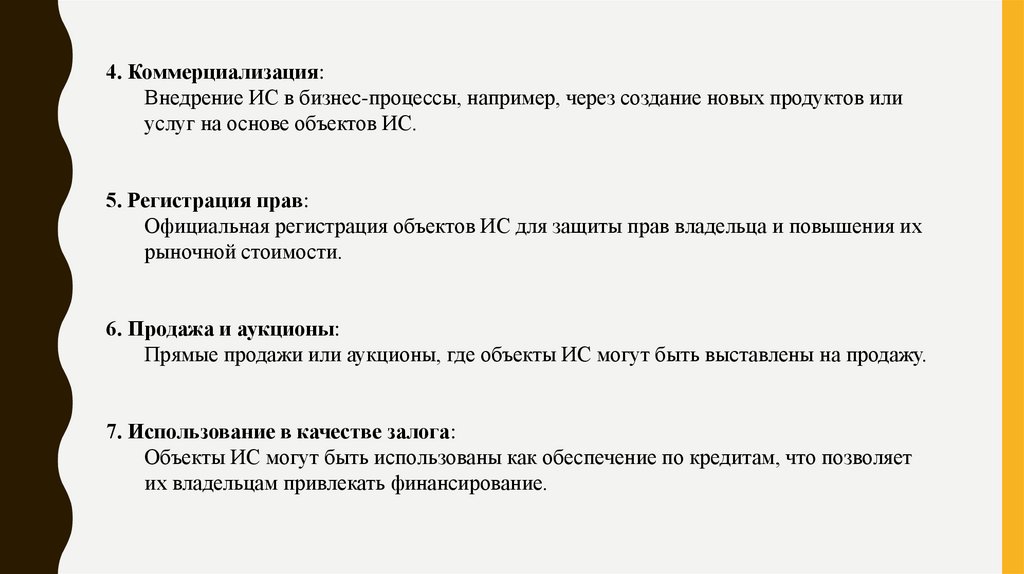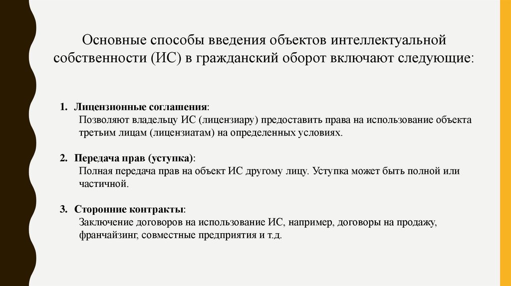 Основные способы введения объектов интеллектуальнойсобственности (ИС) в гражданский оборот включают следующие: