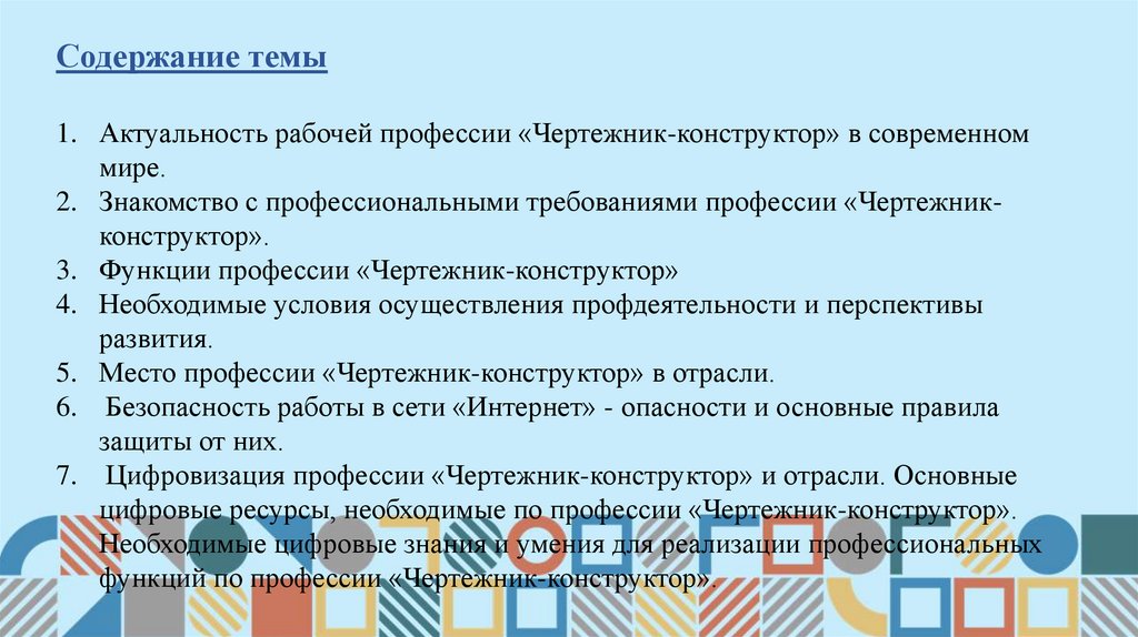 Содержание темы1. Актуальность рабочей профессии «Чертежник-конструктор» в современном