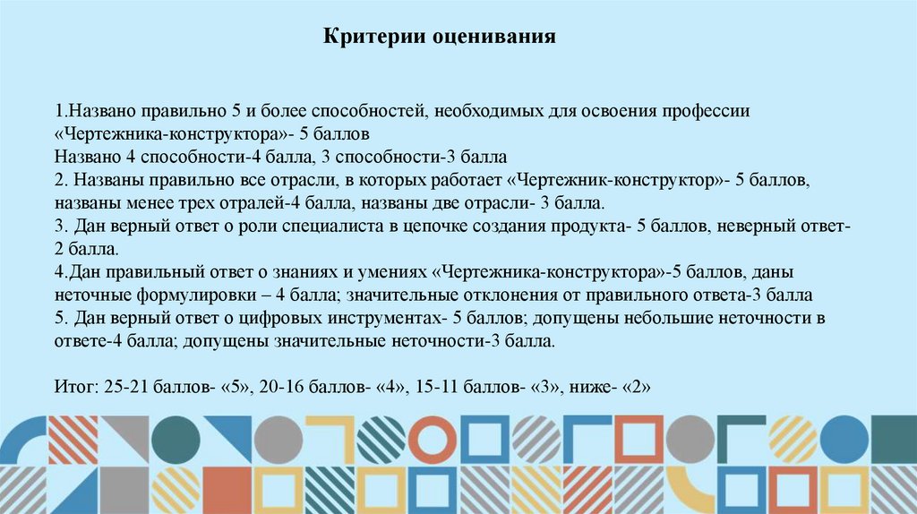 Итог: 25-21 баллов- «5», 20-16 баллов- «4», 15-11 баллов- «3», ниже- «2»
