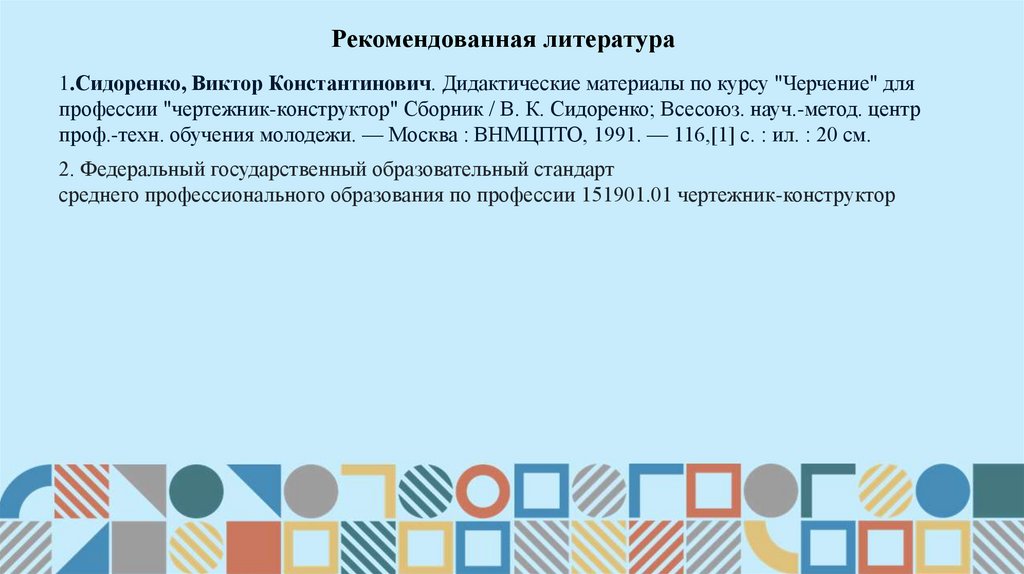 Рекомендованная литература1.Сидоренко, Виктор Константинович. Дидактические материалы по курсу "Черчение" для