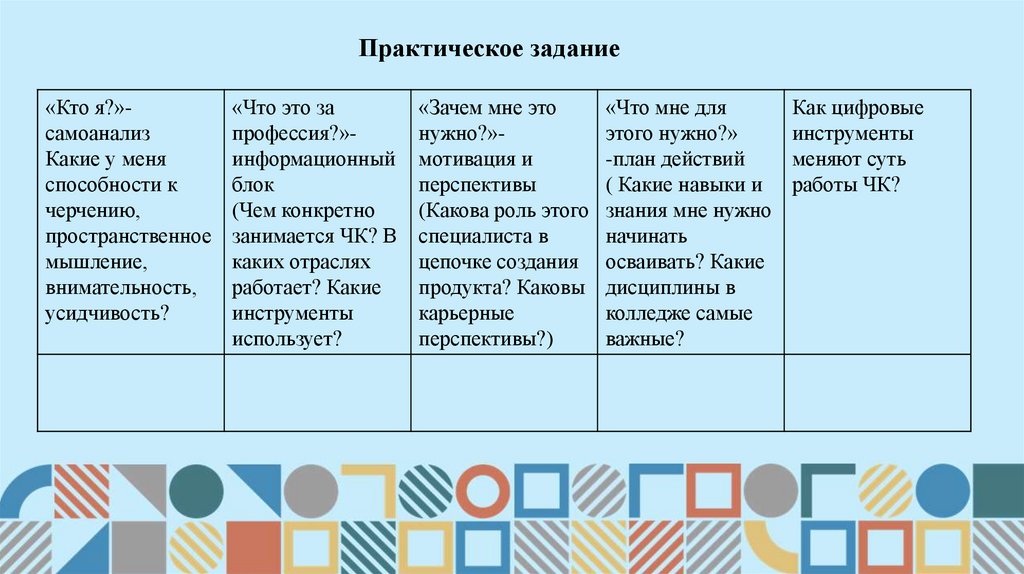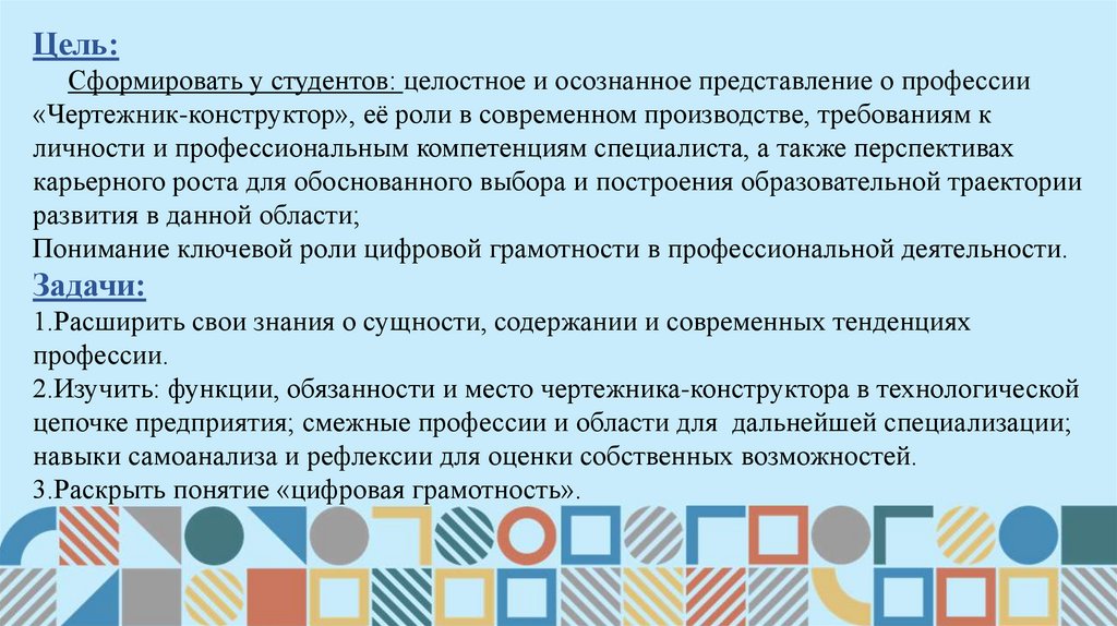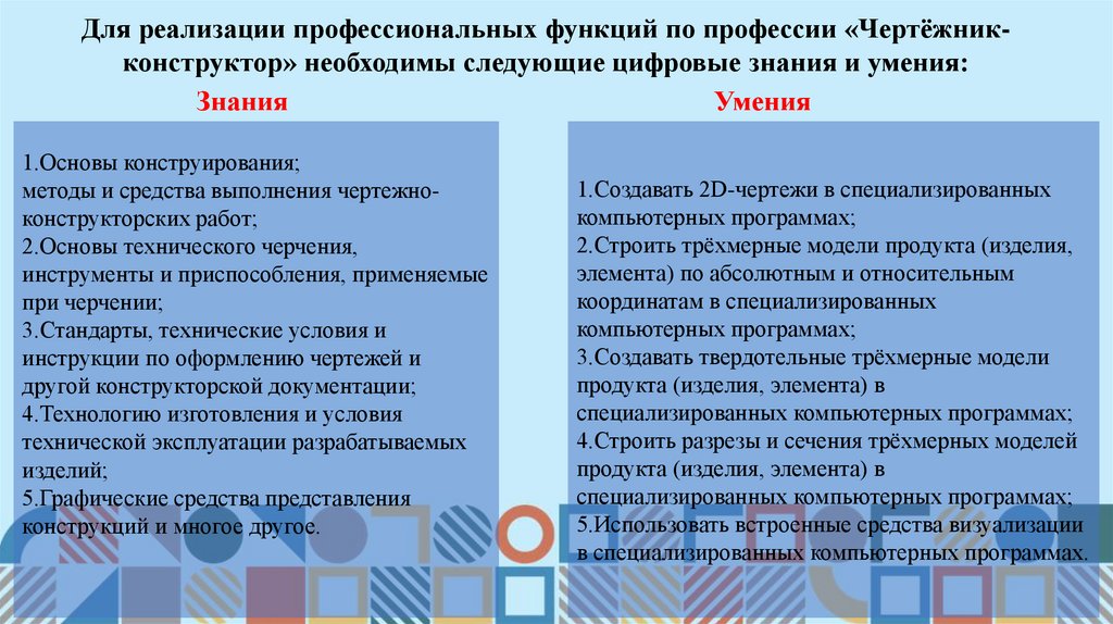 Для реализации профессиональных функций по профессии «Чертёжникконструктор» необходимы следующие цифровые знания и умения:Знания